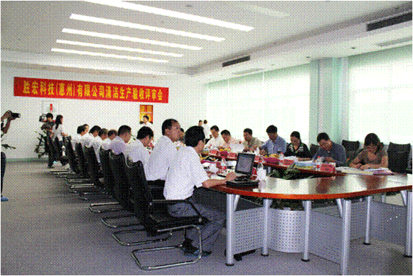 2011年10月19日上午11时,广东省清洁生产中心、惠州市经信局、环保局、科技局等单位的代表以及特邀能源、环保专家,对我司进行清洁生产审核验收,技术依托单位——惠州市惠智通节能环保技术服务有限公司的代表、公司董事长特助赵助理、环保课以及各部经理参加了专家评审会。