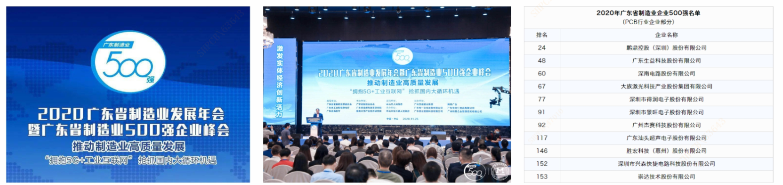 会上发布了2020年广东制造业500强榜单,其中PCB行业企业表现亮眼,我司与鹏鼎控股、生益科技、深南电路、大族激光等29家企业上榜。得利于研发成果初显成效,技术品质双提升,引进国际大客户,产品结构调整升级,扩产项目投产,产能增加,公司营业收入稳步提升,今年公司排名较2019年提升了20名,位列146名。
