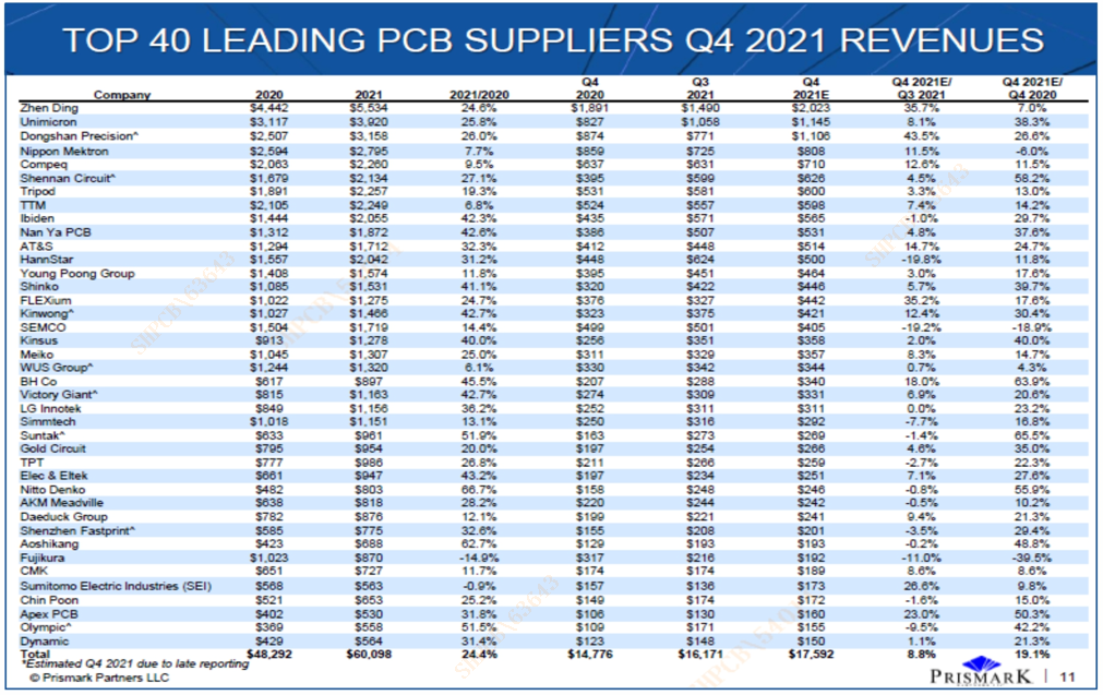 近期,国际知名电子行业咨询集团Prismark Partners发布2021年第四季度全球40强PCB企业排行榜与数据分析报告,共有七家内资企业上榜。其中,东升国际官网科技在2021年第四季度全球PCB企业四十强排行榜中位列第22名,在内资PCB企业中位列第4名。