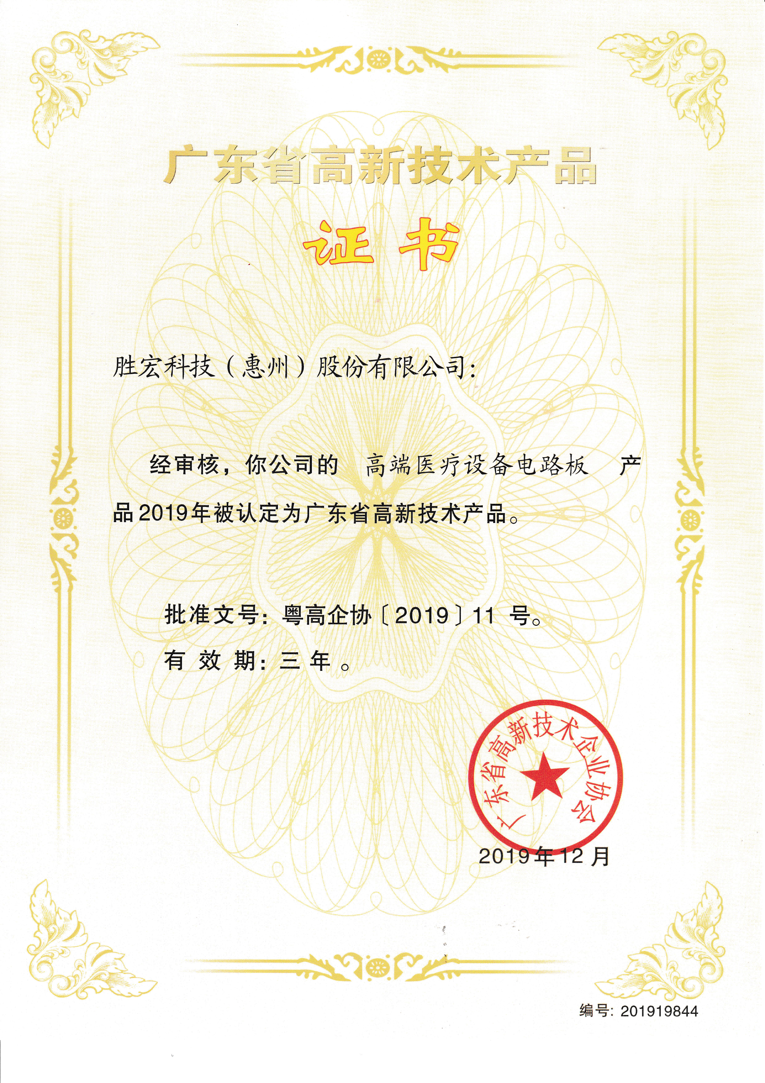 “高端医疗设备电路板”高新技术产品证书